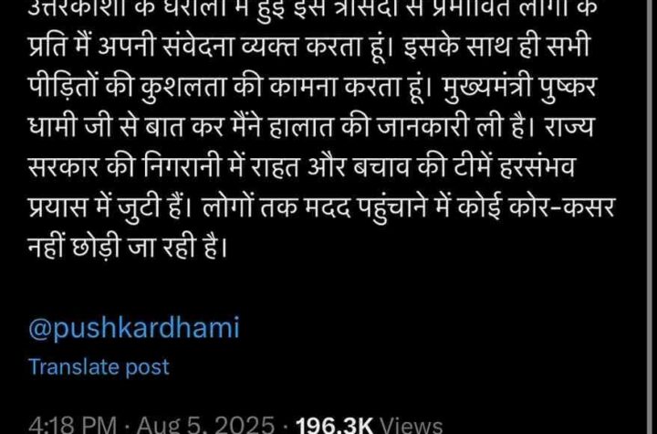 उत्तरकाशी जनपद के हर्षिल क्षेत्र के धराली गांव में बादल फटने की घटना से...