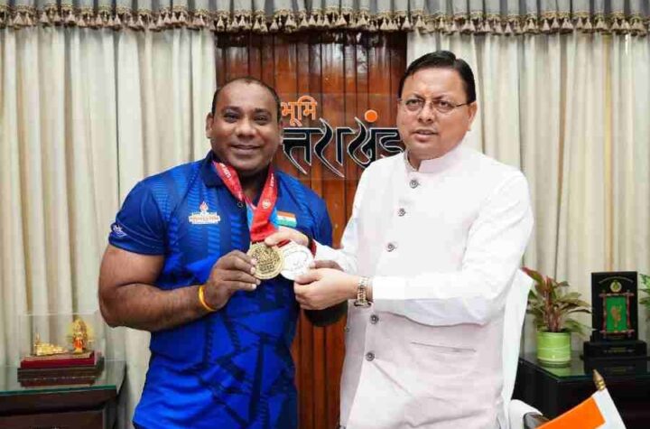 देहरादून: मुख्यमंत्री पुष्कर सिंह धामी से शुक्रवार को मुख्यमंत्री कैम्प कार्यालय में वेटलिफ्टर मुकेश...