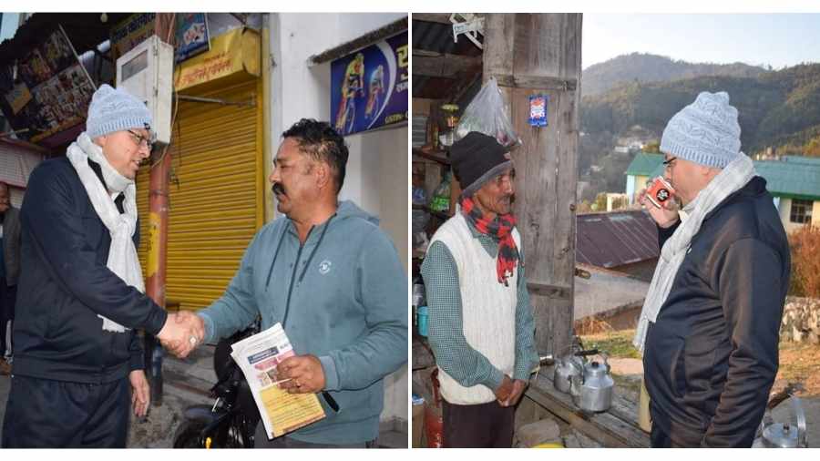 इसी क्रम में आज मुख्यमंत्री पुष्कर सिंह धामी अपने चंपावत भ्रमण के दौरान प्रातः सैर पर निकले। धामी सर्किट हाउस से निकलते हुए ब्लॉक रोड स्थित नित्यानंद जोशी की चाय की दुकान पर पहुंचे और सबसे पहले सूर्य नमस्कार किया। फिर चाय की चुस्की के साथ नित्यानंद जोशी और अन्य लोगों से बात करते हुए उनका हाल चाल जाना। इस दौरान उन्होंने सरकारी योजनाओं, कार्यक्रमों और विकास कार्यों पर चर्चा की। इसी दौरान वहां मौजूद मासूम रियांश से भी उन्होंने बातें की और अपना आशीर्वाद दिया।