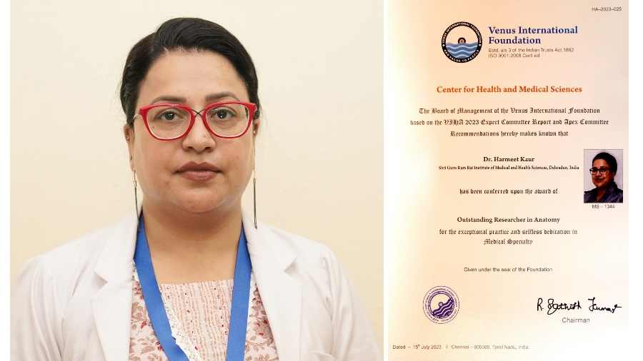 देहरादून। श्री गुरु राम राय इंस्टीट्यूट ऑफ मेडिकल एण्ड हैल्थ साइंसेज (एसजीआरआर मेडिकल काॅलेज) के एनोटाॅमी विभाग की एसोसिएट प्रोफेसर डाॅ हरमीत कौर को हेल्थ कैयर अवार्ड 2023 से नवाजा गया। वीनस इंटरनेशनल फाउंडेशन, चेन्नई की ओर से डाॅ हरमीत कौर को उत्कृष्ट शोधकर्ता के रूप में सम्मानित किया गया। दुनियाभर से अलग अलग विषयों में करीब 100 मेडिकल विशेषज्ञों ने विभिन्न मेडिकल विषयों पर आवेदन किए थे। वीनस इंटरनेशनल फाउंडेशन, चेन्नई द्वारा हर वर्ष हैल्थ केयर अवार्ड 2023 के लिए आवेदन मांगे जाते हैं। डाॅ हरमीत के रिसर्च का मुख्य विषय