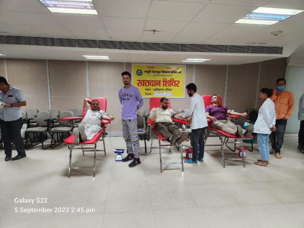 देहरादून: डेंगू के बढ़ते प्रकोप के बीच मसूरी देहरादून विकास प्राधिकरण भी मरीजों की मदद को आगे आया है। आज उपाध्यक्ष एमएमडीए वंशीधर तिवारी की पहल पर प्राधिकरण सभागार में दून मेडिकल कॉलेज के सहयोग से एक वृहद रक्तदान शिविर का आयोजन किया गया जिसमें प्राधिकरण के अधिकारियों व कर्मचारियों ने बढ़चढ़कर भागीदारी की।