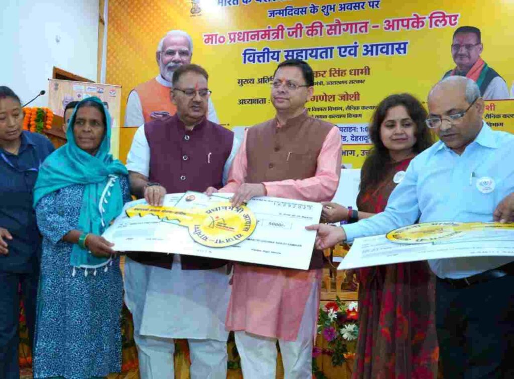 देहरादून। मुख्यमंत्री पुष्कर सिंह धामी ने रविवार को मुख्यमंत्री आवास स्थित मुख्य सेवक सदन में प्रधानमंत्री नरेन्द्र मोदी के जन्म दिवस के अवसर पर प्रधानमंत्री की सौगात-आपके लिए’ कार्यक्रम में राष्ट्रीय ग्रामीण आजीविका मिशन के अन्तर्गत स्वयं सहायता समूहों एवं प्रधानमंत्री आवास योजना-ग्रामीण के अन्तर्गत 11 लाभार्थियों को आवास स्वीकृति पत्र, चाबी एवं घर के लिए बर्तन और सामान क्रय के लिए 05-05 हजार रुपये के चेक प्रदान किये। मुख्यमंत्री ने कहा कि प्रधानमंत्री आवास योजना-ग्रामीण के लाभार्थियों को अब घर के बर्तन और सामान के लिए 06-06 हजार रुपये दिये जायेंगे।