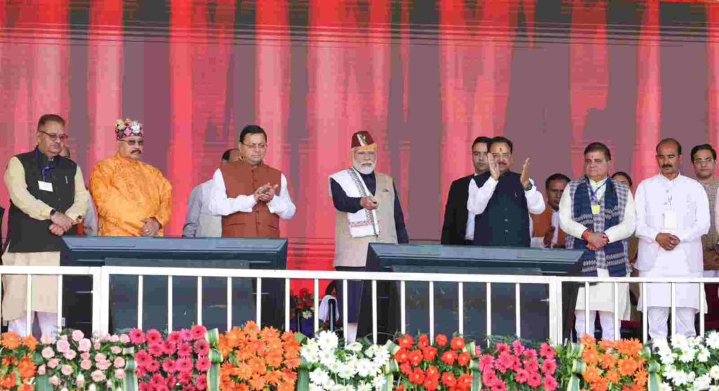 देहरादून। प्रधानमंत्री नरेन्द्र मोदी ने उत्तराखण्ड को लगभग 04 हजार 200 करोड़ रूपये की सौगात दी। पिथौरागढ़ में आयोजित कार्यक्रम में प्रधानमंत्री ने राज्य की 23 महत्वपूर्ण परियोजनाओं का लोकार्पण एवं शिलान्यास किया। राज्य की जिन योजनाओं का शिलान्यास किया गया उनमें 21 हजार 398 पॉलीहाउस निर्माण, उच्च घनत्व वाले सघन सेब बागानों की योजना, राष्ट्रीय राजमार्गों पर 02 लेन एवं ढलान उपचार के 05 कार्य, राज्य में 32 पुलों का निर्माण, एसडीआरएफ के तहत अग्नि सुरक्षा बुनियादी ढांचे और बचाव उपकरणों को मजबूत करना, देहरादून में राज्य आपातकालीन परिचालन केंद्र का अपग्रेडेशन, बलियानाला, जनपद नैनीताल में भूस्खलन की रोकथाम हेतु उपचार, 20 मॉडल डिग्री कॉलेजों में हॉस्टल और कंप्यूटर लैब का निर्माण, सोमेश्वर, अल्मोडा में 100 बिस्तरों वाला उप जिला अस्पताल, चंपावत में 50 बिस्तरों वाले अस्पताल ब्लॉक का निर्माण, रूद्रपुर में वेलो-ड्रोम निर्माण कार्य, स्पोर्ट्स स्टेडियम, हल्द्वानी में एस्ट्रो टर्फ हॉकी मैदान का निर्माण, चार धाम की भांति मानसखंड के मंदिर क्षेत्रों का विकास, मानसखंड मंदिर माला मिशन के अंतर्गत जागेश्वर धाम, हाट कालिका एवं नैना देवी मंदिर में अवस्थापना सुविधाओं का विकास शामिल हैं।
