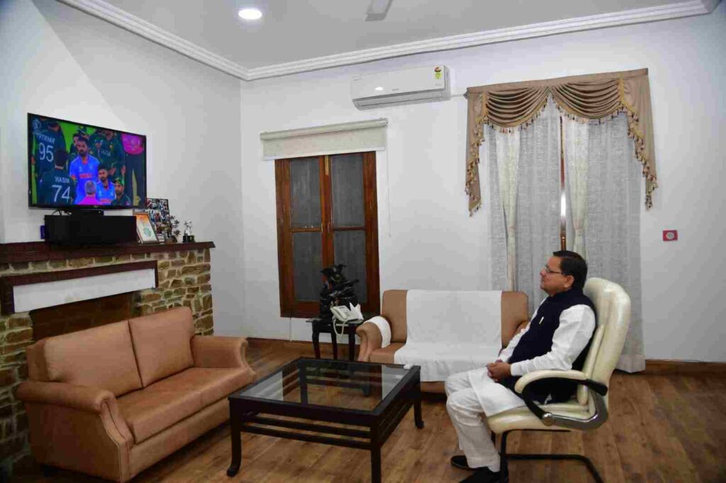 देहरादून। मुख्यमंत्री पुष्कर सिंह धामी ने शनिवार को नरेंद्र मोदी स्टेडियम, अहमदाबाद में भारतीय क्रिकेट टीम द्वारा अपने उत्कृष्ट खेल प्रदर्शन से क्रिकेट विश्व कप के लीग मैच में पाकिस्तान के विरूद्ध शानदान एतिहासिक विजय पर सभी खिलाड़ियों एवं समस्त खेल प्रेमियों को हार्दिक बधाई व शुभकामनाएं दी। मुख्यमंत्री ने स्वयं भी टेलीविजन पर प्रसारित इस मैच का कुछ समय लाइव प्रसारण देखा।