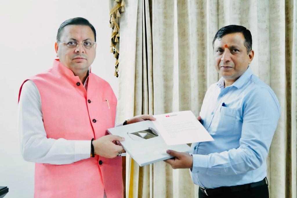 देहरादून। सोशल मीडिया प्लेटफॉर्म यूट्यूब द्वारा मुख्यमंत्री पुष्कर सिंह धामी के ऑफिसियल यूट्यूब चैनल को सिल्वर बटन प्रदान किया गया है। सूचना महानिदेशक बंशीधर तिवारी ने मुख्यमंत्री धामी को यूट्यूब से प्राप्त उनके ऑफिसियल यूट्यूब चैनल का प्रमाणपत्र भेंट किया।