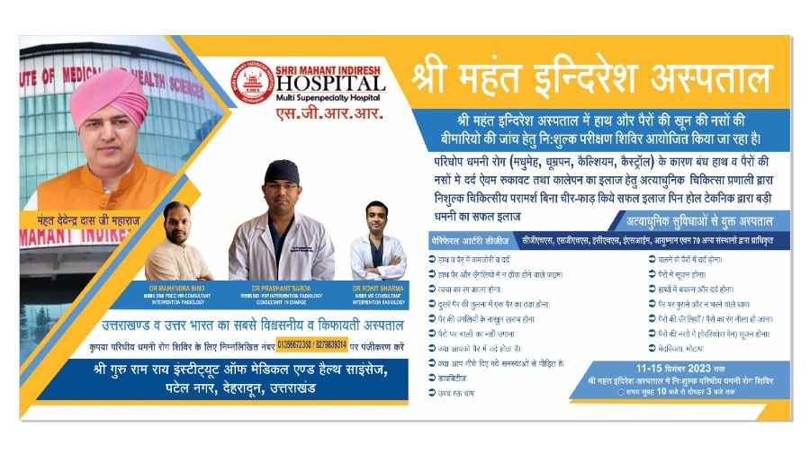 देहरादून: श्री महंत इन्दिरेश अस्पताल में हाथ और पैरों की खून की नसों की बीमारियो की जांच हेतु निःशुल्क परीक्षण श्री महंत इन्दिरेश अस्पताल में बिना चीर-फाड किये सफल इलाज पिन होल तकनीक द्वारा बडी धमनी का सफल उपचार उपलब्ध है। श्री महंत इन्दिरेश अस्पताल में बिना चीर-फाड़ किये पिन होल तकनीक द्वारा बडी धमनी का सफल उपचार उपलब्ध है। इस निःशुल्क परिधीय धमनी रोग शिविर का आयोजन सोमवार 11 दिसंबर 2023 से गुरुवार 15 दिसंबर 2023 तक सुबह 10 बजे से दोपहर 3 बजे तक किया जाएगा।