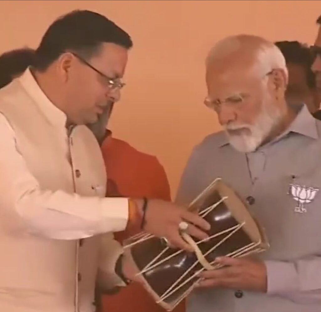 मुख्यमंत्री धामी द्वारा भेंट किए गए हुड़के को बहुत उत्साह से बजाते दिखे प्रधानमंत्री मोदी।