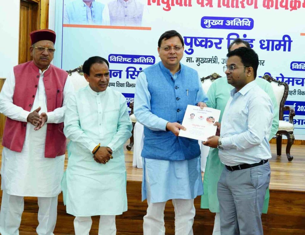 देहरादून। मुख्यमंत्री पुष्कर सिंह धामी ने सोमवार को मुख्यमंत्री आवास स्थित मुख्य सेवक सदन में आयोजित कार्यक्रम में उत्तराखण्ड लोक सेवा आयोग के माध्यम से उच्च शिक्षा विभाग में चयनित 68 असिस्टेंट प्रोफेसर, शहरी विकास विभाग में चयनित 63 अधिशासी अधिकारी एवं 22 कर व राजस्व निरीक्षकों को नियुक्ति पत्र प्रदान किए।