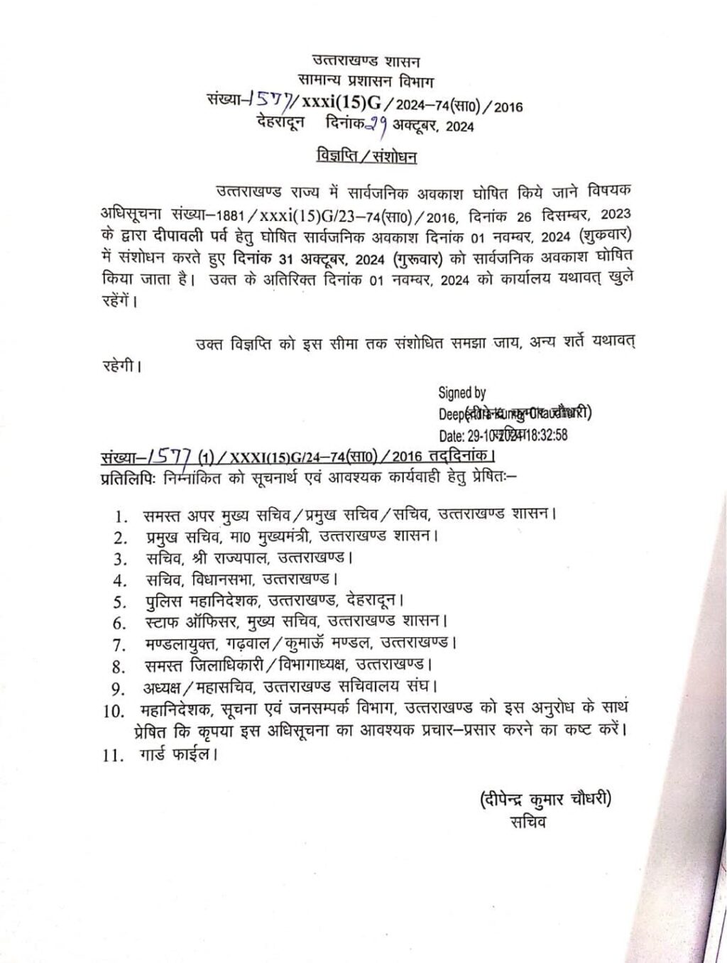देहरादून। उत्तराखंड से बड़ी खबर सामने आ रही है उत्तराखंड में दीपावली को लेकर सार्वजनिक अवकाश में बदलाव किया गया है पहले 1 नवंबर को सार्वजनिक अवकाश प्रदेश में घोषित किया गया था लेकिन अब सरकार के द्वारा 31 अक्टूबर को सार्वजनिक अवकाश घोषित किया गया है और 1 नवंबर को सभी कार्यालय खुले रखे जाने का आदेश जारी हुआ है।
