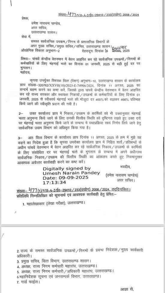 राज्य निगम कर्मचारी महासंघ, उत्तराखण्ड की पहल पर राज्य के विभिन्न निगमों, सार्वजनिक उपक्रमों और स्वायतशासी संस्थाओं में कार्यरत सभी कर्मचारियों के हित में एक ऐतिहासिक निर्णय लिया गया है। सरकार ने पांचवे/छठवें केन्द्रीय वेतनमान के तहत 11 प्रतिशत महंगाई भत्ते (डीए) का शासनादेश जारी किया है। इस महत्वपूर्ण निर्णय के लिए राज्य निगम कर्मचारी महासंघ ने मुख्यमंत्री पुष्कर सिंह धामी के प्रति हार्दिक आभार व्यक्त किया है। महासंघ का कहना है कि इस निर्णय से हजारों कर्मचारियों को सीधा आर्थिक लाभ मिलेगा और उनके जीवन स्तर में सुधार होगा। यह शासनादेश लंबे समय से चली आ रही कर्मचारियों की मांग को पूरा करने वाला कदम है।