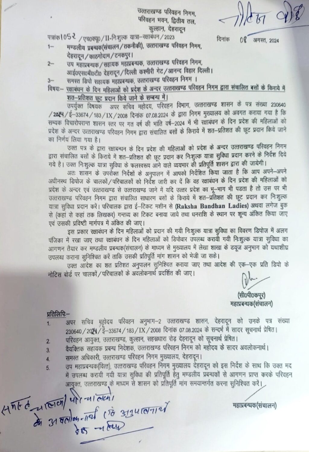 शासन के उपरोक्त निर्देशों के अनुपालन में आपको निर्देशित किया जाता है कि आप अपने-अपने अधीनस्थ डिपोज के चालकों/परिचालकों को निर्देश जारी कर दें कि वह रक्षाबंधन के दिन प्रदेश की महिलाओं को प्रदेश के अन्दर एवं उत्तराखण्ड से उत्तराखण्ड जाने में यदि उत्तर प्रदेश का भू-भाग भी पडता है तो उस पर भी उत्तराखण्ड परिवहन निगम द्वारा संचालित साधारण बसों के किराये में शत-प्रतिशत की छूट प्रदान कर निःशुल्क यात्रा सुविधा प्रदान करें। परिचालक द्वारा ई-टिकट मशीन से (Raksha Bandhan Ladies) अथवा लगेज बुक से (कहां से कहां तक लिखकर) गन्तव्य का टिकट बनाया जाये तथा धनराशि के स्थान पर शून्य अंकित किया जाए एवं उसकी प्रविष्टी मार्गपत्र में अंकित की जाए।
