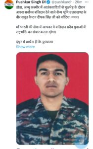 देहरादून: जम्मू-कश्मीर के डोडा में सुरक्षाबलों और आतंकियों के बीच गोलीबारी में उत्तराखंड का एक जवान बलिदान हो गया। वहीं, इस मुठभेड़ में चार आतंकियों के मारे जाने की सूचना है। मुख्यमंत्री पुष्कर सिंह धामी ने आतंकवादियों से मुठभेड़ के दौरान अपना सर्वोच्च बलिदान देने वाले सैन्य भूमि उत्तराखण्ड के वीर सपूत कैप्टन दीपक सिंह को नमन किया है। उन्होंने कहा कि माँ भारती की सेवा में उनका ये बलिदान सदैव युवाओं में राष्ट्रभक्ति का संचार करता रहेगा। उन्होंने ईश्वर से पुण्यात्मा को श्रीचरणों में स्थान देने एवं शोक संतप्त परिजनों को यह दुःख सहने की शक्ति प्रदान करने की प्रार्थना की है।