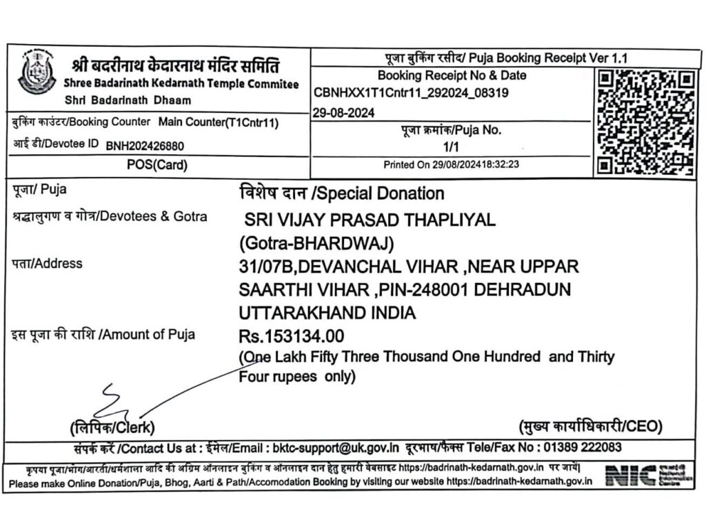 मुख्य कार्याधिकारी विजय प्रसाद थपलियाल ने बताया कि वह श्री बदरीनाथ -केदारनाथ मंदिर समिति में सेवा के लिए आये है उन्होंने 29 जुलाई 2024 को मंदिर समिति में पदभार ग्रहण किया था आज 29 अगस्त को एक महीने की सेवा पूरी होने पर गुरुवार एकादशी के शुभ दिवस पर उन्होंने अपनी आस्था -विश्वास से एक माह की वेतन की धनराशि भगवान बदरीविशाल तथा भगवान केदारनाथ के चरणों में भेंट की है।