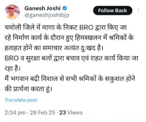 माणा गांव में हिमस्खलन, कैबिनेट मंत्री गणेश जोशी ने मजदूरों की सुरक्षा की प्रार्थना की